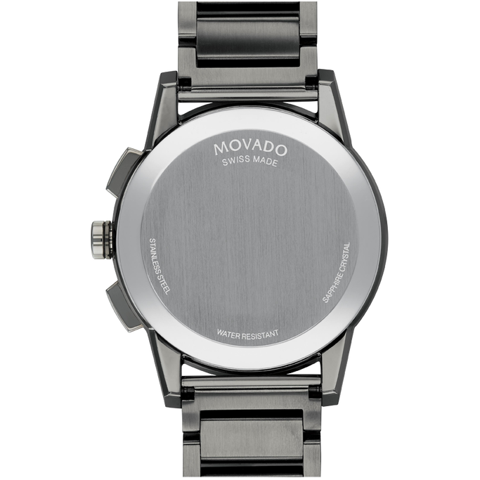 Movado Museum Sport Chronograph, 43 mm gunmetal PVD-finished stainless steel case with black PVD-finished bezel. Features a black chronograph dial and gunmetal PVD-finished bracelet.