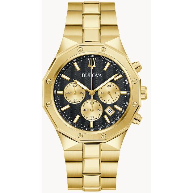 Bold, modern design characterizes this 6-hand chronograph from the Classic Bulova Prestige men’s collection. The watch features a faceted 40mm gold-tone stainless steel case with a geometric bezel, flat sapphire crystal with anti-reflective coating, 100m of water resistance, and a chamfered 3-link bracelet with a combination of brushed and polished finishes and a push-button deployant closure. The black textured dial with elegant striping has gold-tone hands and applied markers with Super-LumiNova luminescent fill, a date display, and gold-tone sub-dials including a 24-hour display. Highly functional with a distinctive design, this timepiece is suited for any occasion, from the everyday to the extraordinary.