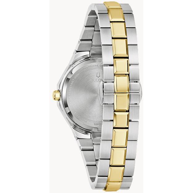Bold, elevated design characterizes this Classic Bulova Prestige women’s timepiece that balances bold design with an elegant presence. The watch features a faceted 32mm gold- and silver-tone stainless steel case with a geometric bezel, flat sapphire crystal with anti-reflective coating, 100m of water resistance, and a chamfered 3-link bracelet with brushed and polished finishes and a push-button deployant closure. The lustrous mother-of-pearl dial has gold-tone hands and applied markers with Super-LumiNova luminescent fill, 8 dazzling diamonds, and a date display. Striking in both its modernity and its sophistication, this Bulova ladies’ watch is an ideal companion on any wrist.