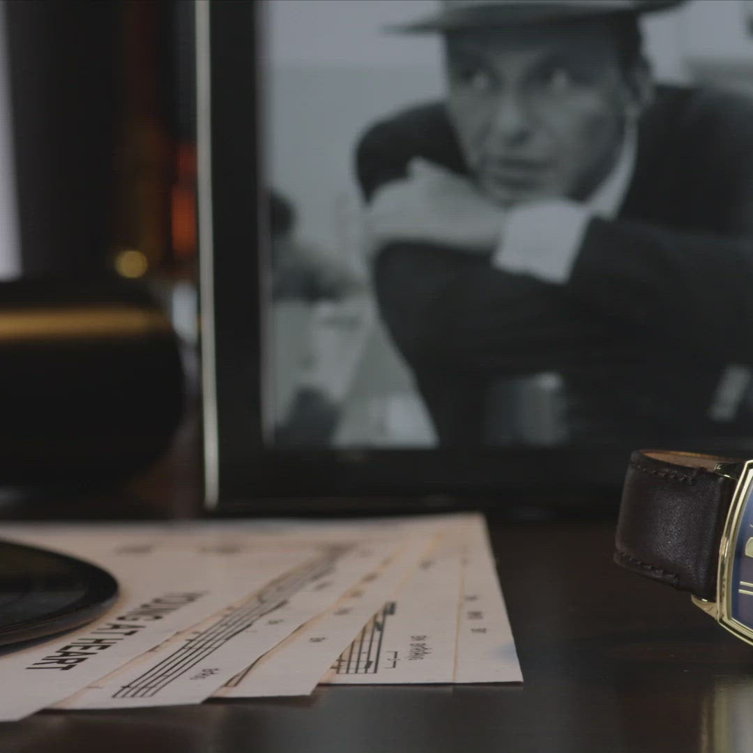 Incorporating vintage Bulova designs with the unmistakable elements of legendary performer, Frank Sinatra, the ‘My Way’ watch features a stainless steel rectangular case with a black dial, gold-tone hands and markers. Frank Sinatra’s signature is displayed under the Bulova logo and his iconic Fedora hat is etched on the gold-tone crown, as well as on the case back along with the name, ‘My Way’. A distinct second hand sub sweep adds an elegant touch. The gray textured leather strap features a deployant buckle and is stamped with ‘My Way’ along the inside. Watch features a curved sapphire crystal and water resistance to 30 meters.