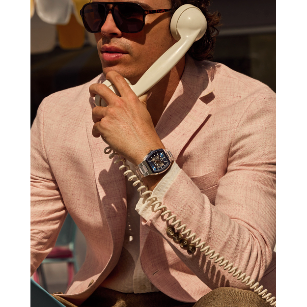 This Bulova men’s watch from the Maquina collection offers daringly avant-garde design. The watch features a 40mm rose gold- and silver-tone stainless steel case with a curved sapphire crystal, a blue bezel, and a silver-tone stainless steel bracelet with a push-button deployant closure. The blue patterned dial with black dial ring and bridges has rose-gold tone hands and markers with luminescent fill and a central aperture revealing the inner workings of the 21-jewel automatic, also visible through a transparent case back, skeletonized movement which has a 42-hour power reserve. With its mechanical heart and unrivaled modern form, this Bulova men’s timepiece offers a uniquely individual expression of style.