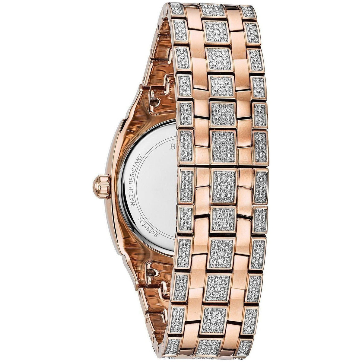 Dress watch opulently embellished with 582 crystals on the cushion-shaped stainless steel and rose gold-tone case and bracelet, and round pave set three-hand silver white dial with date feature. Curved mineral crystal, deployant closure, quartz movement, and water resistance to 30 meters.